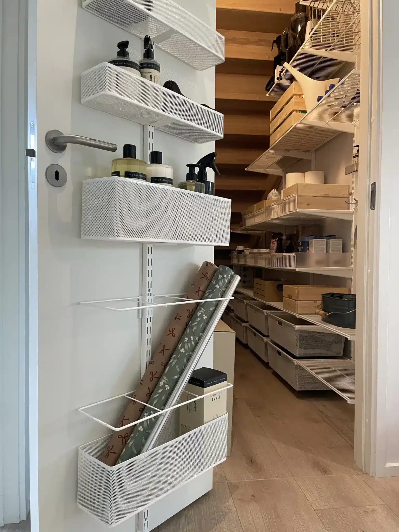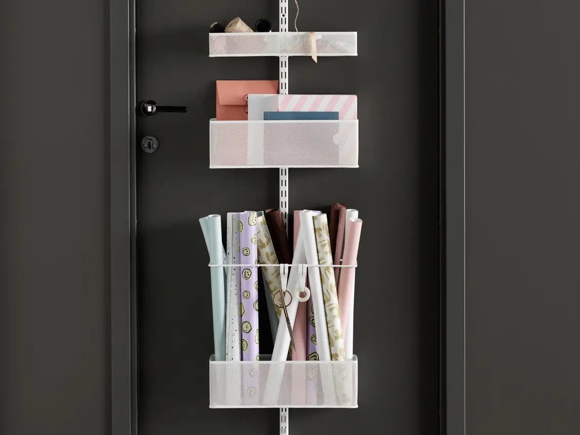 Držák pro zavěsení na vertikální lišty (nástěnné, závěsné i stojiny volněstojícího systému). Určený k ukládání a organizaci předmětů, jako jsou role dárkového balení, plakáty nebo deštníky. Vhodný pro použití s dveřním závěsem a nástěnnou lištou pro uložení na dveřích.